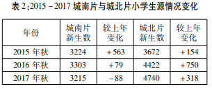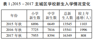 一是學齡人口由農村向城市轉移。近年來,隨著城鄉一體化發展以及戶籍制度改革和房地產去庫存優惠政策的刺激下,進城買房和農村轉移人口逐年遞增。2015-2017年,主城區生源以800~2000人/每年的速度遞增,學齡人口由農村向城市轉移,出現了“城鎮擠”“鄉村空”的現象。
