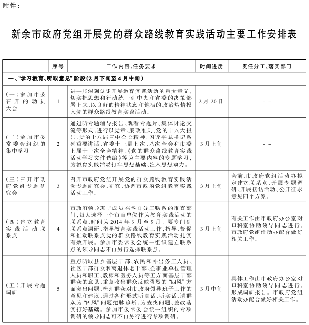附件:新余市政府黨組開(kāi)展黨的群眾路線教育實(shí)踐活動(dòng)主要工作安排表