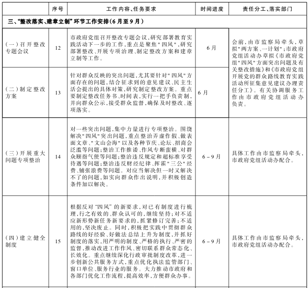 整改落實(shí)、建章立制是開(kāi)展好教育實(shí)踐活動(dòng)的根本。重點(diǎn)針對(duì)作風(fēng)方面的突出問(wèn)題,提出解決對(duì)策,制定和落實(shí)整改方案,并通過(guò)建章立制,把成果鞏固下來(lái)、堅(jiān)持下去。主要做好以下工作:(一)召開(kāi)整改專題會(huì)議。6月上旬,市政府黨組召開(kāi)整改專題會(huì)議,研究部署教育實(shí)踐活動(dòng)下一步的工作,重點(diǎn)是聚焦“四風(fēng)”,研究部署整改、開(kāi)展專項(xiàng)治理、制定整改方案和建章立制等工作。