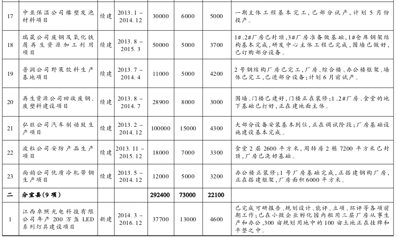 2、高新區23個項目22個在建,累計完成投資78億元;分宜縣9個項目7個在建,累計完成投資221億元;渝水區11個項目8個在建,累計完成投資157億元;仙女湖區7個項目全部在建,累計完成投資209億元。贛西供電公司2個項目1個在建,累計完成投資128億元。