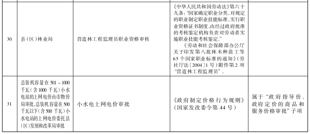 同時,結實我市實際,將其中的“外國醫師來華短期行醫注冊”“營造林工程監理員職業資格審核”“權限內漁業捕撈許可”共3項行政審批事項下放至縣(區)(見附件2);將其中的“小水電上網電價審批”共1項行政審批事項在市、縣(區)兩級審批權限上給予了明確(見附件2)。