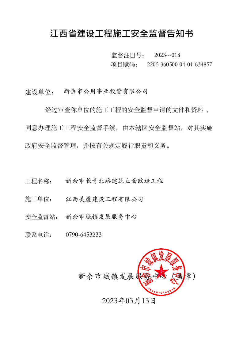 新余市長青北路建筑立面改造工程安監(jiān)告知書