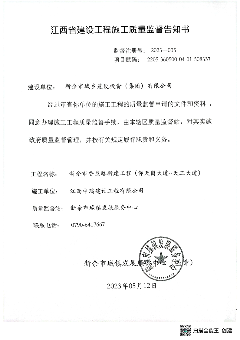 市香泉路新建工程質(zhì)量監(jiān)督告知書