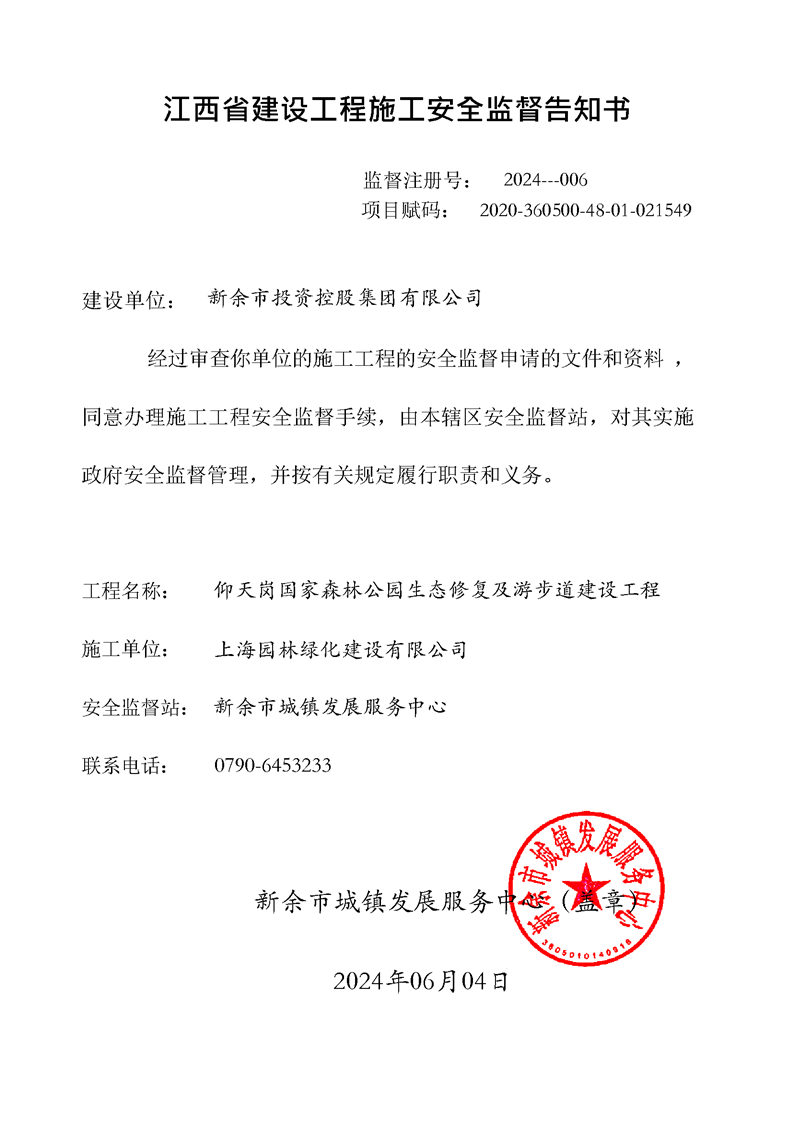 [質量安全監督信息]仰天崗國家森林公園生態修復及游步道建設工程-建筑工程施工安全監督告知書