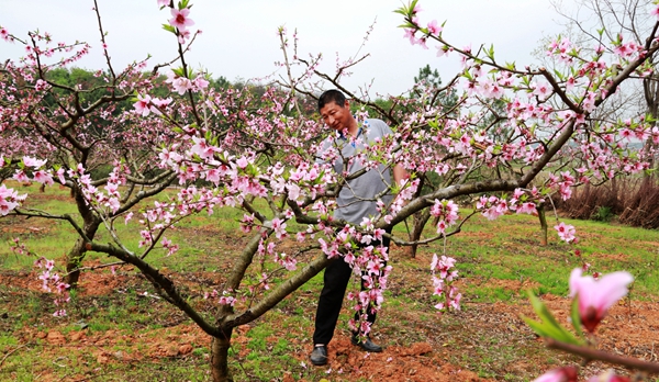 3月23日,渝水區南安鄉高峰村優質桃基地,果農正忙著給桃樹疏花作業。渝水區積極引導果農加強果樹花期管理,提高果品產出率和果品質量,力爭達到果樹豐產、果農增收。