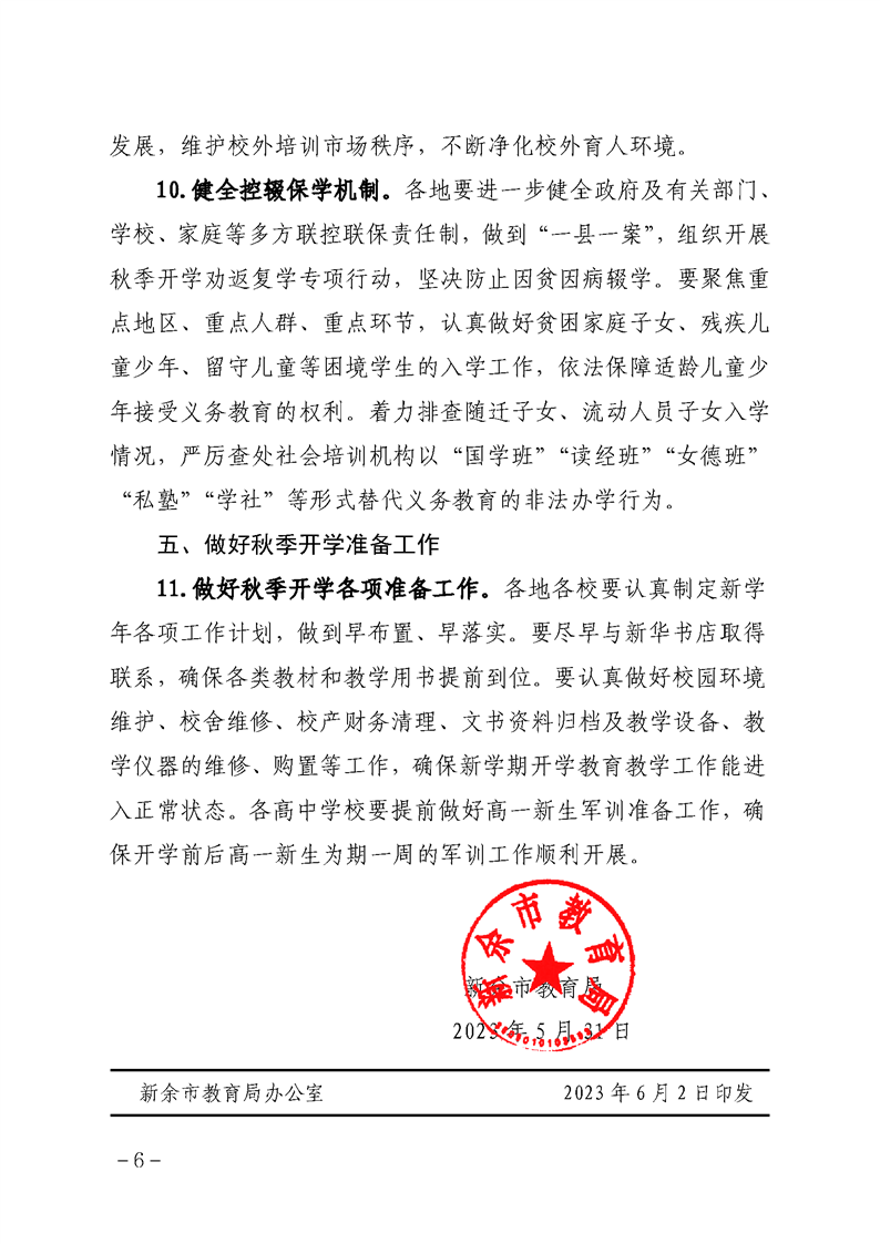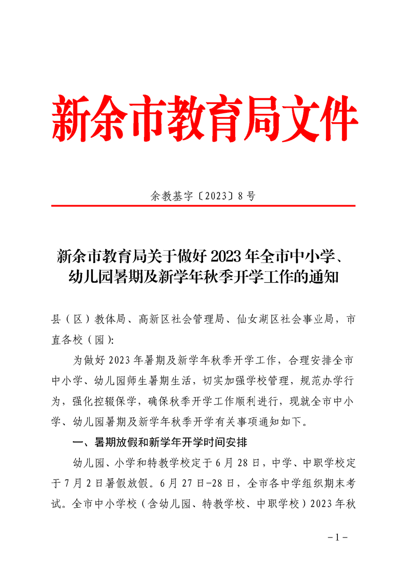【招生政策】新余市教育局關于做好 2023 年全市中小學、幼兒園暑期及新學年秋季開學工作的通知